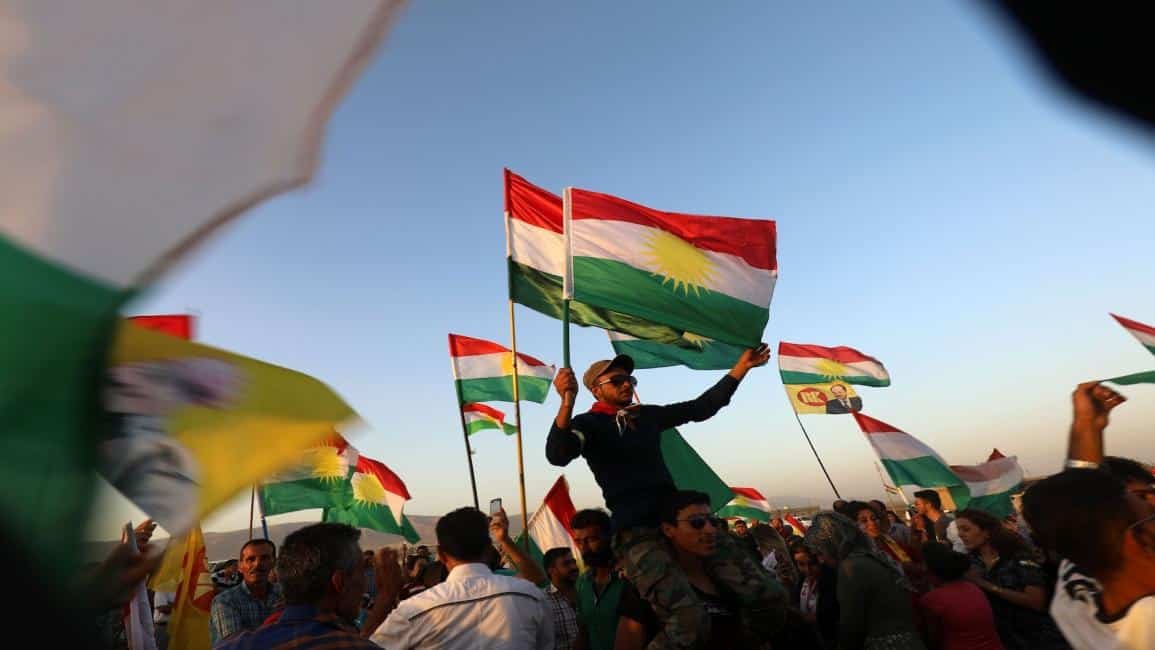 سوريون أكراد يلوحون بالعلم الكردي في القامشلي شمال شرق سورية (27/9/2017/فرانس برس)